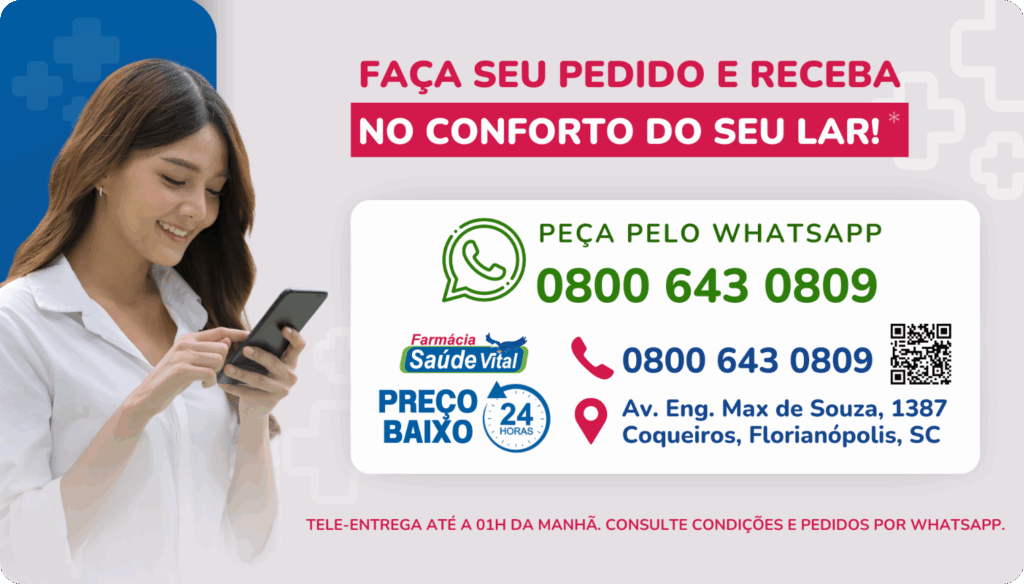 A Farmácia Saúde Vital é a melhor opção para tele entregas. Oferecemos preços baixos e um atendimento humanizado 24 horas por dia, cobrindo Florianópolis, São José, Biguaçu e Palhoça.